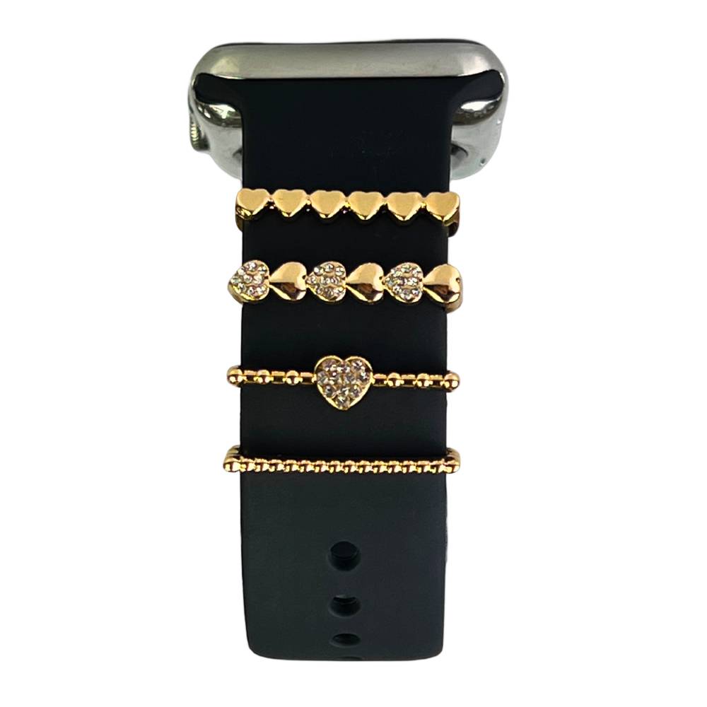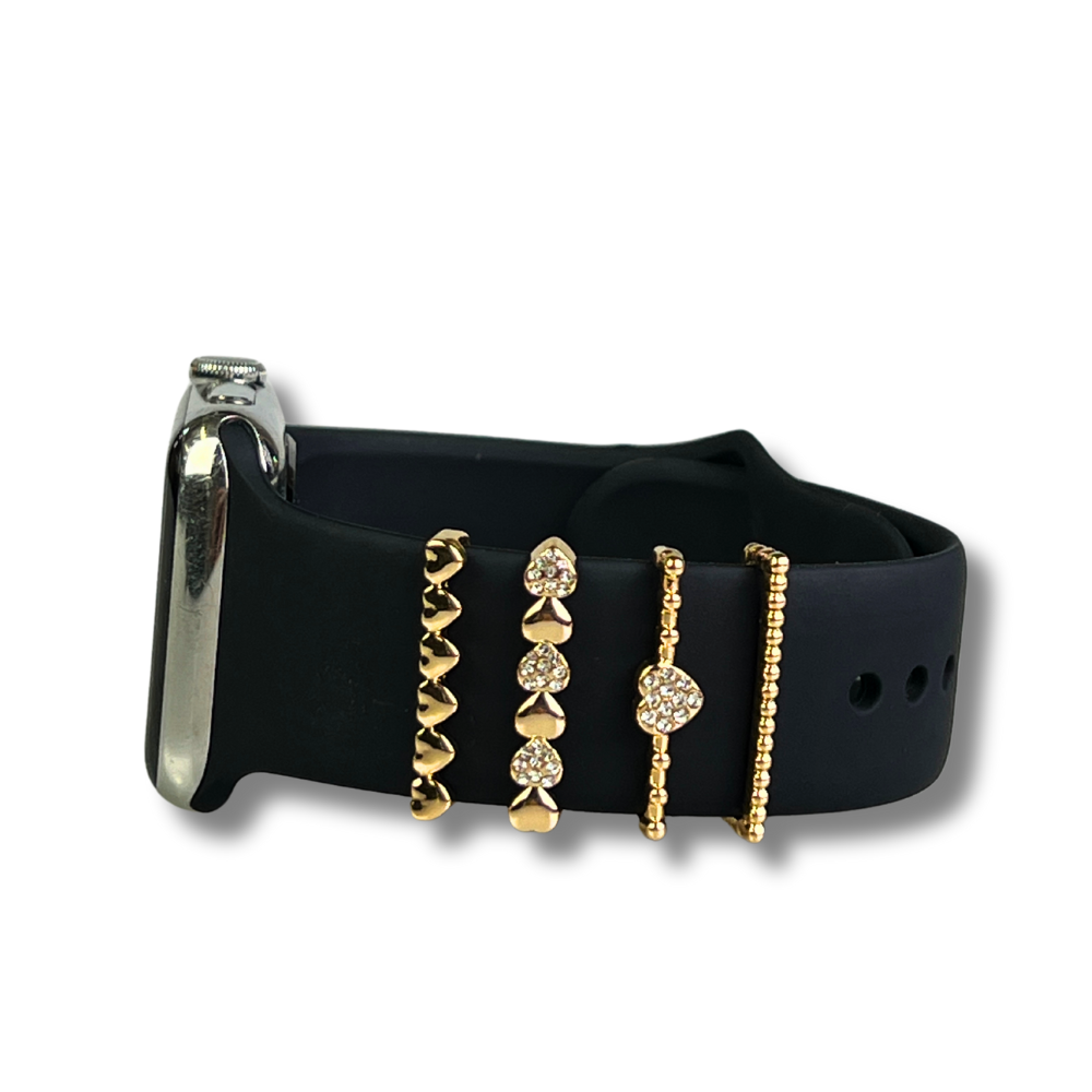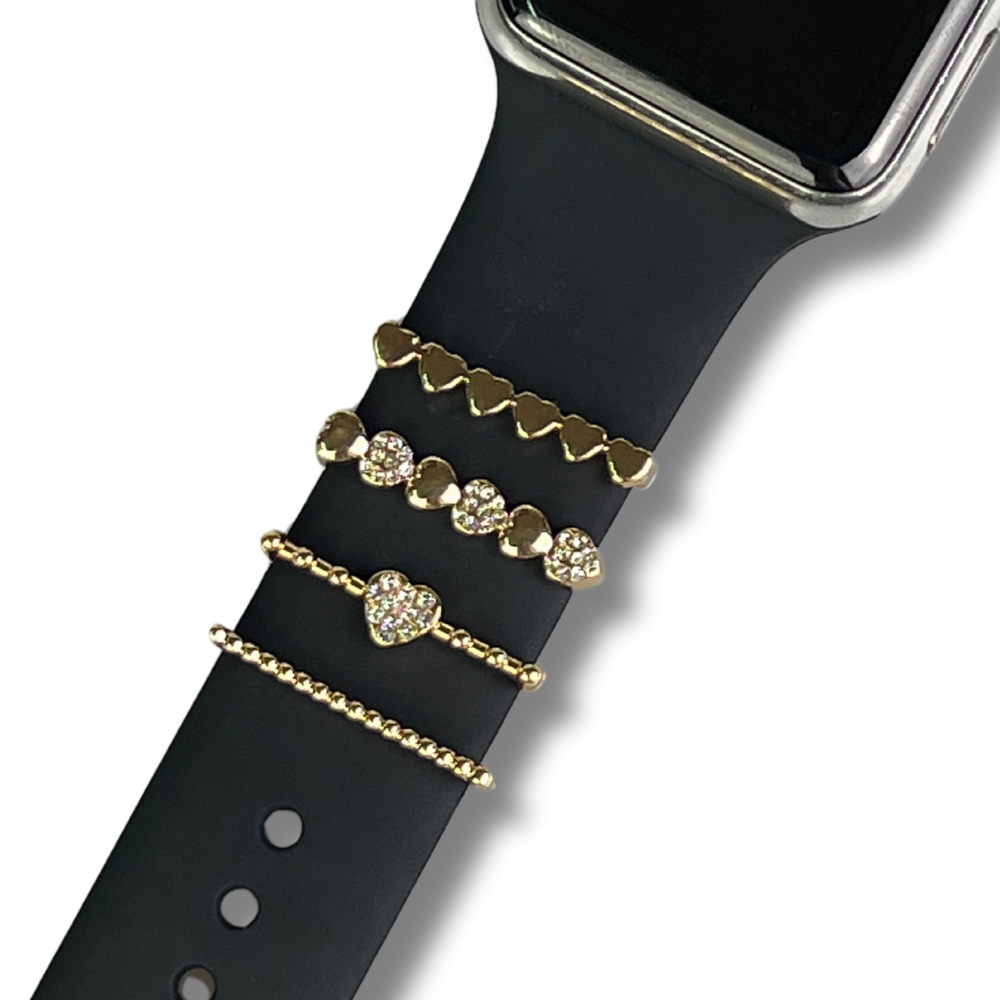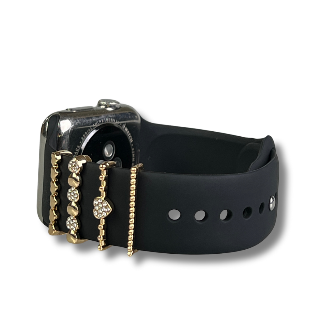 Zestaw nr 2 wyróżnia się błyszczącymi elementami przypominającymi diamentowe kuleczki oraz rząd opalizujących serduszek. To styl romantyczny i dziewczęcy, który dodaje uroku każdemu smartwatchowi.